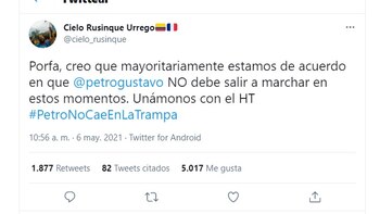 La activista Cielo Rusinque, muy cercana al petrismo, manifestó que Petro no debe salir a marchar en estos momentos. “Porfa, creo que mayoritariamente estamos de acuerdo en que Gustavo Petro NO debe salir a marchar en estos momentos. Unámonos con el HT #PetroNoCaeEnLaTrampa”.