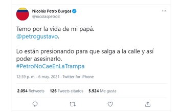 “Que no sea una marcha mía, sino de la gente, yo iré allí, como uno más. No vamos a hablar de votos, ni elecciones”, aclaró Petro. Una propuesta que fue respondida con temor por sus seguidores en redes sociales, incluso por su hijo, diputado del departamento del Atlántico, Nicolás Petro. “Temo por la vida de mi papá. Lo están presionando para que salga a la calle y así poder asesinarlo. #PetroNoCaeEnLaTrampa”, indicó.