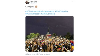 Con cantos y sus teléfonos celulares encendidos, decenas de personas se concentraron en la noche de miércoles en Cartagena para rendirle tributo a quienes han muerto en las protestas de la última semana en el país.