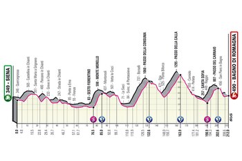 Aún en los Apeninos será de exigencia para los ciclistas, pues tendrá dos puertos de segunda categoría, uno de tercera y uno de primera: la llegada final. Los últimos 500 me serán en un camino de grava y tendrán alcanzan picos del 14 % de inclinación.