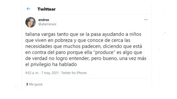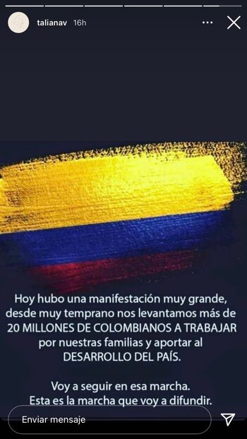 Dicha imagen, que ya no aparece en el perfil de la joven, ya sea porque pasaron las 24 horas o porque la eliminó, fue compartida en Twitter, donde están pidiendo que se cancele a la influenciadora por hacer parte del discurso “yo no paro, yo produzco”.