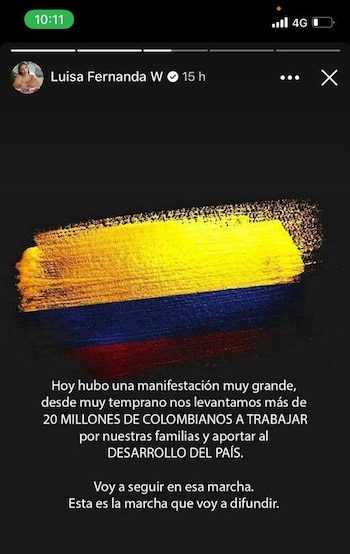 A pesar de esto, días antes, Luisa Fernanda se ha referido a las marchas con publicaciones que piden que no haya más violencia. “No más masacres, visibilicemos la realidad, no más muertos. ¿Cómo es posible que ayer en un live miles de personas presenciaron la muerte de un inocente? Esto no es justo (...) Solo le pido a Dios que esta situación mejore. ¡Este mensaje es por la vida!”, escribió la paisa.