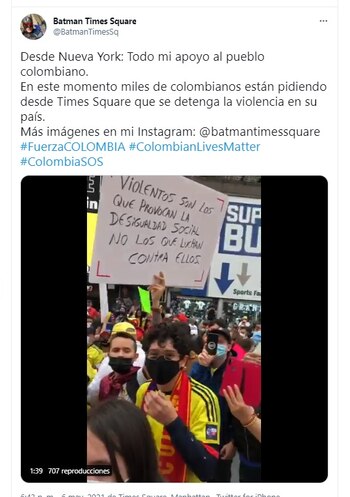 En Nueva York, un sector de la comunidad colombiana se manifestó frente a la sede de las Naciones Unidas para pedirle a la organización internacional que intervenga y ayude frente a la crisis que vive el país. Este grupo de colombianos se trasladó luego hacia Times Square y lograron llenar la emblemática intersección de avenidas en Manhattan.