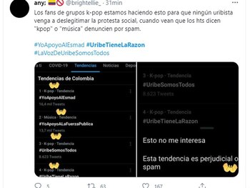 El pasado 3 de mayo con el hashtag #UribeTieneLaRazón, que comenzó a ser utilizado por seguidores del líder del expresidente para respaldarlo, terminó siendo una tendencia a nivel nacional que sabotearon los k-popers. Lo que buscan es evitar que Álvaro Uribe y sus seguidores deslegitimen la protesta social. Así lo manifestó la usuaria @brightellie.