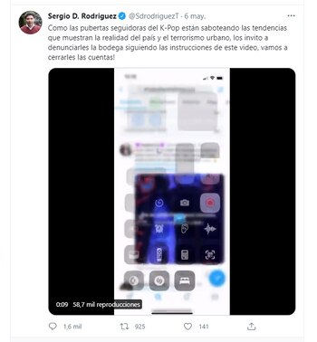 Ante esta nueva actividad que se toma la red social de Twitter, ya le apareció un rival a los k-popers. Se trata del activista de ultraderecha Sergio Rodríguez, quien se mostró molesto por el saboteo y tildó de “pubertas” a quienes están detrás de eso.