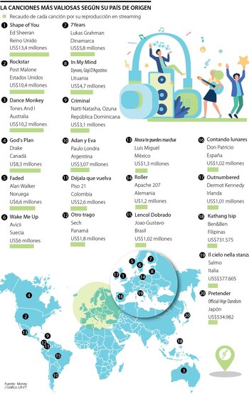 Representando a Colombia aparece Piso 21 con Déjala que vuelva, como la canción con mejores utilidades, (US$2,6 millones, gracias a 544,7 millones de reproducciones).