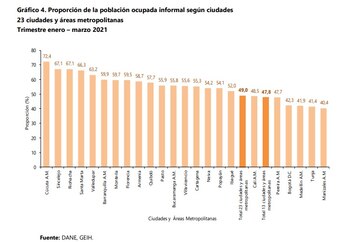 Entretanto, la ciudades con menor menor proporción de informalidad —del total de las 23 analizadas— fueron: Manizales A.M. (40,4 %), Tunja (41,4 %), Medellín A.M. (41,9%), Bogotá (42,3 %) y Pereira A.M. (47,7 %).