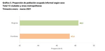 El informe presentado por el Dane también dejó ver que en 13 ciudades* y sus áreas metropolitanas (Bogotá, Medellín, Cali, Barranquilla, Bucaramanga, Manizales, Pasto, Pereira, Cúcuta, Ibagué, Montería, Cartagena y Villavicencio) la proporción de hombres ocupados que eran informales fue de 47,4 %, mientras que para las mujeres fue de 48,3 %.