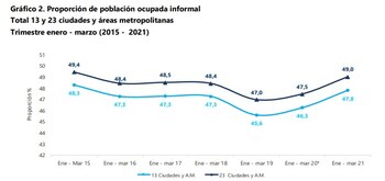 Entre enero y marzo de este 2021, la informalidad laboral en 23 ciudades y áreas metropolitanas en el país fue del 49 %, de acuerdo con el Dane; es decir, 1,5 puntos porcentuales más que para el mismo periodo de 2020, cuando apenas se estaban comenzando a ver los impactos socioeconómicos del covid-19 en Colombia. Así lo evidenciaron los datos recaudados por la entidad en La Gran Encuesta Integrada de Hogares (GEIH).