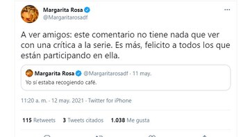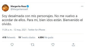 Sin embargo, este no fue el único pronunciamiento de De Francisco sobre la novela. En otro de sus peculiares trinos, Margarita se volvió a referir al tema, dio a entender que después de participar en alguna producción o serie se desentiende completamente de sus personajes y se quedan en el olvido.