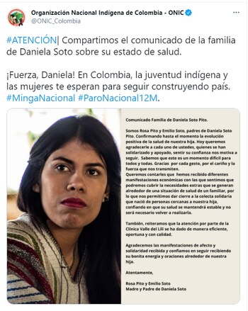 “Somos Rosa Pito y Emilio Soto, padres de Daniela Soto Pito. Confirmando hasta el momento la evolución positiva de la salud de nuestra hija”, con este mensaje inicia el comunicado oficial que emitió este miércoles la familia de la joven indígena que resultó herida con un disparo en el abdomen, después de las acciones violentas entre habitantes de Cali y la minga indígena el pasado domingo.