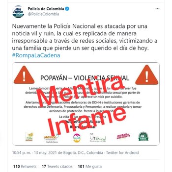 La Policía Nacional tildó la noticia como una “mentira infame”. “Nuevamente la Policía Nacional es atacada por una noticia vil y ruin, la cual es replicada de manera irresponsable a través de redes sociales, victimizando a una familia que pierde un ser querido el día de hoy”, aseguró la institución.