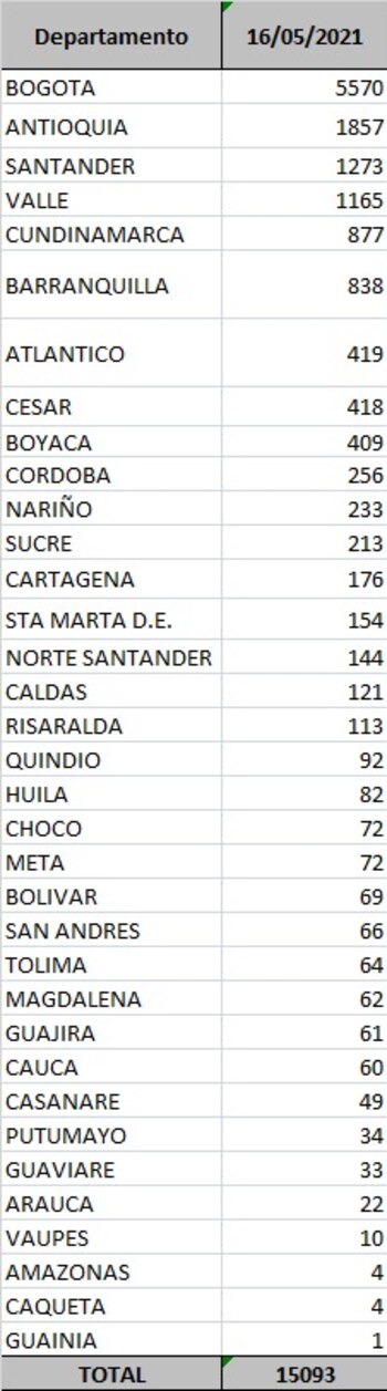 El Ministerio de Salud y Protección Social reportó, este domingo 16 de mayo, 15.093 casos nuevos de covid-19 en Colombia. En las últimas 24 horas se procesaron 61.558 pruebas de las cuales 38.812 son PCR y 22.746 de antígenos.
