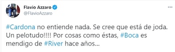 Flavio Azzaro, otro periodista reconocido en Argentina, también se despacho contra Edwin Cardona, publicando: “Cardona no entiende nada. Se cree que está de joda. Un pelotudo!!!! Por cosas como éstas, Boca es mendigo de River hace años…”.