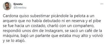 Hubo quienes criticaron a Cardona no sin cierta sátira, tal es el caso de Ernesto Provitilo, de TyC Sports: “Cardona quiso subestimar picándole la pelota a un arquero que no había debutado ni en reserva y el pibe se fue hacia un costado, charló con un compañero, respondió unos dm de Instagram, se sacó un café de la máquina, bajó un parlante que estaba muy alto y volvió y se lo atajó”.