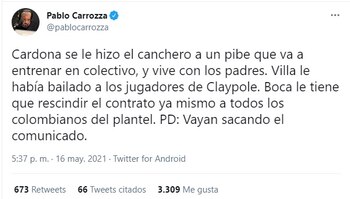 En redes sociales tampoco parecen perdonar a ‘Crackdona’, como se le ha llegado a decir por su bien pie. Uno de quienes reaccionó fue el periodista argentino Pablo Carroza, quien en su cuenta en Twitter arremetió no solo contra él, sino contra los demás colombianos que juegan en Boca Juniors:
