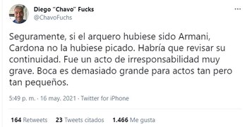 La cuenta BOCA JUNIORS en Twitter, que no es la oficial del club, sino de aficionados al conjunto xeneize, también manifestó su inconformismo por la manera de patear de Cardona, quien, ante los ojos de algunos, subestimó al portero rival.