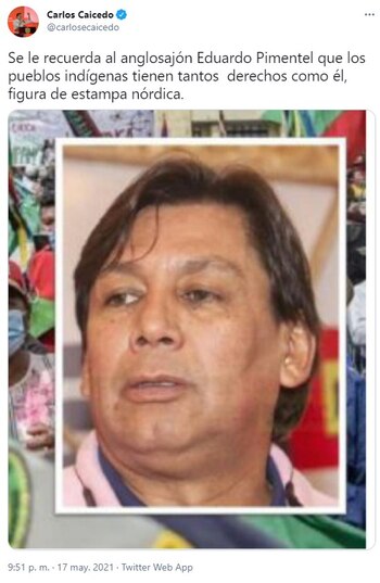 Caicedo publicó una imagen del rostro de Pimentel y escribió: “Se le recuerda al anglosajón Eduardo Pimentel que los pueblos indígenas tienen tantos derechos como él, figura de estampa nórdica”.