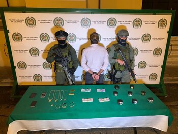 “Alias ‘Matamba’ fue sorprendido cuando celebraba su cumpleaños en un lujoso apartamento, donde se incautaron 9 millones de pesos en efectivo, 12.500 dólares, un lingote de oro de 500 gramos (avaluado en 109 millones de pesos), 4 relojes avaluados en 150 millones de pesos y un arma de fuego tipo revólver calibre 22 con 06 cartuchos”, señaló la institución en un comunicado.