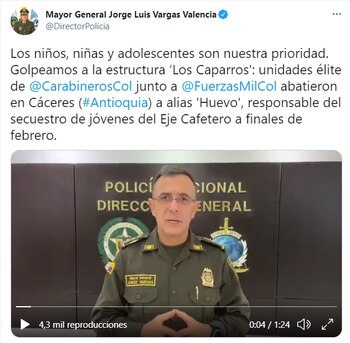 El general de la Policía, Jorge Vargas, confirmó la noticia por medio de un video en su cuenta de Twitter, en el que explicó que en “dos importantes operaciones contra el grupo organizado ‘Los Caparros’ en el bajo Cauca, después de un enfrentamiento, se logra la neutralización de un sujeto como ‘Huevo’, se le incautó una granada, una pistola y otros elementos”. Además del reclutamiento de menores, a ‘Huevo’ se le acusa por ser el encargado de extorsiones y finanzas ilegales con la minería en esa zona del país.