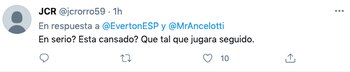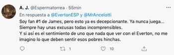“Soy fan #1 de James, pero esto ya es decepcionante. Ya nunca juega... Siempre hay unas excusas todas incomprensibles. Y si así es el sentimiento de uno que nada que ver con el Everton, no me imagino lo que deben sentir esos pobres hinchas”, indicó uno de los usuarios en Twitter.