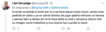 Otra persona aseveró que pareciera que al colombiano ya no tiene motivaciones de jugar: “Cuando se pierde el amor por lo q se hace pasan estas cosas James esta podrido en plata y ya no siente ánimos de jugar podría retirarse un tiempo y pensar bien q desea así no le hace daño al club y tampoco afecta más su imagen como futbolista q muy bueno fue cuando le nacía”.
