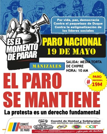 El Gobierno y el Comité Nacional del Paro se han reunido dos veces y no se ha llegado a ningún acuerdo, razón por la que este 19 de mayo se convocó a una nueva jornada de manifestaciones. Se tiene entendido que el 20 de mayo habrá una posible instalación de mesa de negociación para darle fin a las manifestaciones. Sin embargo, los representantes del Paro aseguraron que no cederán si no se para la violencia contra los manifestantes.
