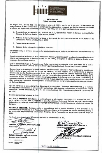“En mérito de lo expuesto, la decisión de los integrantes de la Mesa Directiva de la honorable Cámara de Representantes es: Convóquese una sesión plenaria el día martes, 25 de mayo de 2021, a partir de las 2:00 p.m., con el propósito de escuchar al señor ministro de defensa nacional, doctor Diego Molano Aponte, para que en esta sesión expongan los hechos que originan la presente solicitud de moción de censura”, se lee en el documento emitido.