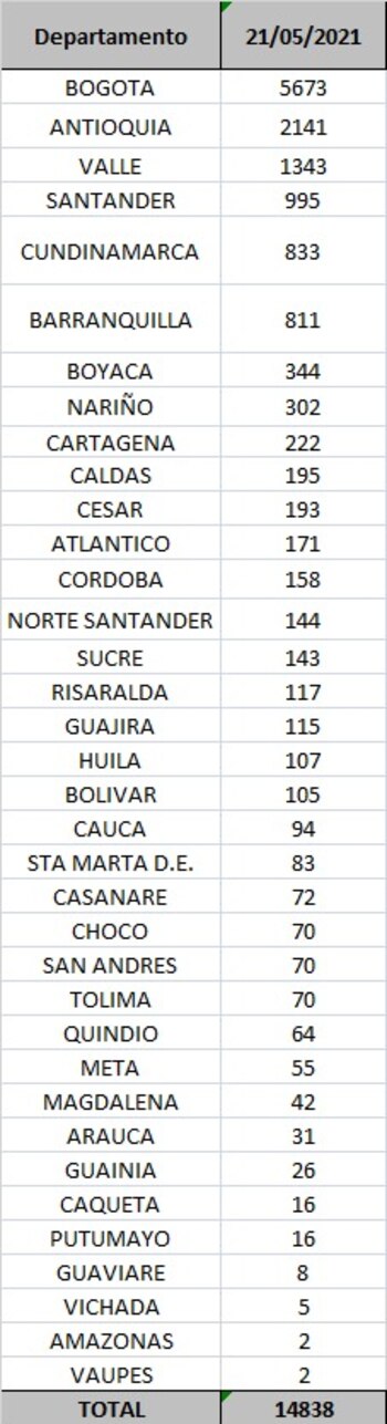 El Ministerio de Salud y Protección Social reportó, este viernes 21 de mayo, 14.838 casos nuevos de covid-19 en Colombia. En las últimas 24 horas se procesaron 70.523 pruebas de las cuales 39.443 son PCR y 31.080 de antígenos.