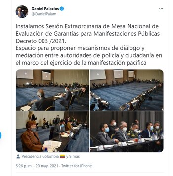 Este 20 de mayo el ministro del Interior, Daniel Palacios, instaló la Mesa Nacional de Evaluación de Garantías para Manifestaciones Públicas, que entre otras funciones, tiene la facultad de proponer un mecanismo de diálogo y mediación entre las autoridades de Policía y la ciudadanía, en el marco de las protestas sociales en Colombia.