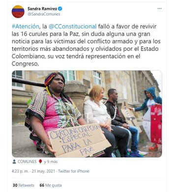 La senadora de los Comunes Griselda Lobo dijo: “La Corte falló a favor de revivir las 16 curules para la Paz, sin duda alguna una gran noticia para las víctimas del conflicto armado y para los territorios más abandonados y olvidados por el Estado Colombiano, su voz tendrá representación en el Congreso”.