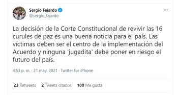 El precandidato a la presidencia Sergio Fajardo también se sumó a los comentarios que exaltan la decisión del alto tribunal: “La decisión de la Corte Constitucional de revivir las 16 curules de paz es una buena noticia para el país. Las víctimas deben ser el centro de la implementación del Acuerdo y ninguna ‘jugadita’ debe poner en riesgo el futuro del país”.
