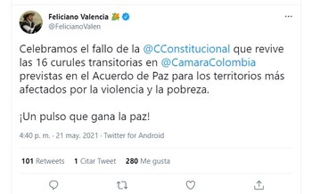 Por su parte, el senador indígena Feliciano Valencia celebró la noticia escribiendo: Celebramos el fallo de la Corte Constitucional que revive las 16 curules transitorias en la Cámara de Representantes previstas en el Acuerdo de Paz para los territorios más afectados por la violencia y la pobreza. ¡Un pulso que gana la paz!”.