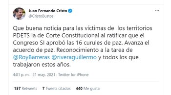La noticia fue celebrada por diferentes políticos que ven esto como un triunfo. Así lo expresó el exministro Juan Fernando Cristo: “Que buena noticia para las víctimas de los territorios PDETS la de Corte Constitucional al ratificar que el Congreso SI aprobó las 16 curules de paz. Avanza el acuerdo de paz. Reconocimiento a la tarea de Roy Barreras y todos los que trabajaron estos años”.
