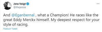 Uno de los que vio en Egan algo de Merckx fue el pedalista Jens Voigt, uno de los mejores pedalistas que dio Alemania y que ostenta el récord de 17 participaciones en el Tour de Francia, junto con George Hincapie y Stuart O’Grady. En su cuenta en Twitter compartió: