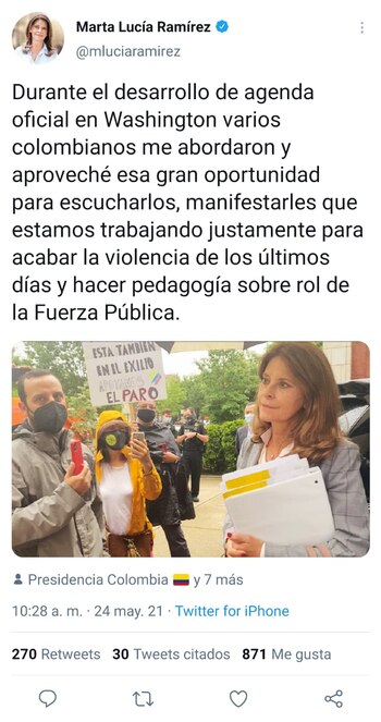 La vicepresidenta Marta Lucía Ramírez inició su agenda como nueva canciller en una visita a Washington, la capital de Estados Unidos, donde fue abordada por un grupo de manifestantes colombianos que le exigieron a ella, así como al embajador de Colombia en esa nación, Francisco Santos, que dieran respuestas sobre los heridos y desaparecidos en el marco del paro nacional.