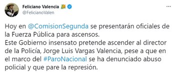 Entretanto, el senador Feliciano Valencia manifestó su inconformismo argumentando que, “este Gobierno insensato pretende ascender al director de la Policía, Jorge Luis Vargas Valencia, pese a que en el marco del Paro Nacional se ha denunciado abuso policial y que pare la represión”.