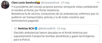 “Hago un llamado al Distrito Capital, para que, en un gesto de búsqueda de consenso con la ciudadanía que hoy se manifiesta, adopten el cambio propuesto por ellos, por los mismos ciudadanos, en la denominación del Portal Américas y que sea renombrado oficialmente como: Portal Resistencia”, afirmó la concejala en un comunicado a la Alcaldía de Bogotá.