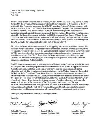 La misiva, firmada por Antony J. Blinken, Richard Trumka de la AFL-CIO, Mary Kay Henry de la SEIU y James P. Hoffa de la Hermandad Internacional de Camioneros, también indicó que el gobierno Biden debe pronunciarse públicamente en contra del uso excesivo de la fuerza por parte de las instituciones colombianas de Defensa.