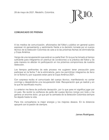 “El cuerpo técnico de la Selección Colombia Masculina de Mayores informa que el jugador James Rodríguez ha sido desconvocado para los juegos ante Perú y Argentina por las clasificatorias a la Copa Mundial de la FIFA Catar 2022, y la CONMEBOL Copa América 2021”, informó la Federación Colombiana de Fútbol.