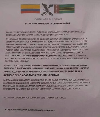 “En la Sabana de Bogotá, grupos de izquierda radical y guerrilleros camuflados de derechos humanos han instrumentalizado jóvenes y mamertos del paro para promover el caos y la anarquía en las calles de diferentes ciudades del departamento, sembrando odio en la sociedad y deslegitimando a nuestra fuerza pública. Estos malp***dos revoltosos se han valido de sus discursos socialistas y adoctrinamiento en redes sociales para incendiar el país. ¡H*****tas!, con la asistencia militar también llegamos nosotros a Facatativá. Los vamos a torturar y quebrar a ustedes y a sus familias si siguen mari****ndo, para que sepan que esto no es un juego”, dice uno de los párrafos del panfleto.