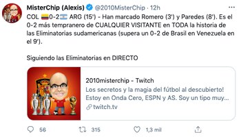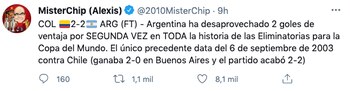 Por último, el citado historiador español también indicó que, con el empate final de Colombia, es la segunda vez en la historia de las eliminatorias para la Copa del Mundo que a Argentina le levantan un 2-0 a favor. El único antecedente databa del 6 de septiembre del 2003, en un partido que la ‘Albiceleste’ le ganaba 2-0 a Chile en Buenos Aires y terminó con igualdad 2-2.