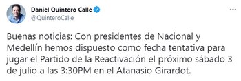 Medellín, por ejemplo, será una de las capitales que seguirá el ejemplo de Barranquilla, de acuerdo con el alcalde Daniel Quintero. Lo que contempla el mandatario es un encuentro amistoso entre ‘El poderoso de la montaña’ y Atlético Nacional el próximo 3 de junio en el Atanasio Girardot, con aforo controlado, al que denominó el “partido de la reactivación”.