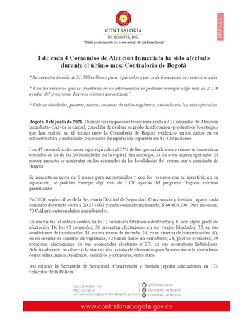 La entidad señaló que, después de una inspección técnica de 43 Comandos de Atención Inmediata (CAI) de la ciudad que realizó la Contraloría, evidenciaron que varios de ellos resultaron gravemente afectados durante los actos vandálicos que han sucedido en el último mes. Para reparar los daños causados en estos lugares, la entidad prevé que se necesitarán cerca de $1.300 millones de pesos y al menos seis meses.