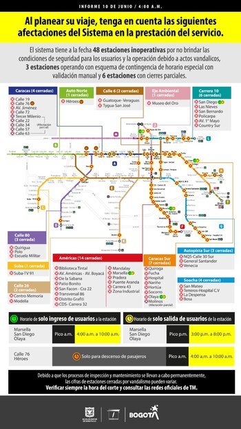 Las estaciones Marsella, San Diego y Olaya funcionan entre 4:00 a 10:00 a.m para ingreso con validación portátil y de 3:00 a 8:00 p.m. para salida de usuarios. Entre tanto, las estaciones Calle 76 y Héroes, afectadas principalmente el pasado 28 de mayo, únicamente están operando para la salida de usuarios de 4:00 a 10:00 a.m..