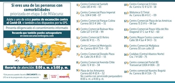Las personas con comorbilidades que aún no han sido contactadas por su EPS, podrán acercarse sin agendamiento previo a los siguientes puntos habilitados en distintos centros comerciales de Bogotá. Sin embargo, si se quiere evitar hacer largas filas de espera, esta población podrá autoagendar su cita de vacunación ingresando a vacunacionbogota.com. En esta página web podrán verificar si se encuentran priorizados en ‘Mi vacuna’, seleccionar el punto donde desean ir a vacunarse, ingresar los datos personales y agendar su hora y fecha de vacunación.