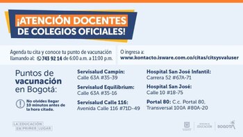 La población docente de los colegios del Distrito, deben asistir bajo la modalidad de agendamiento con el prestador de salud, Servisalud, a los siguientes puntos habilitados: