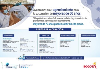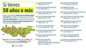 Las personas de 50 años o más, que aún no han sido contactadas por su EPS, podrán acercarse sin agendamiento previo a los siguientes puntos habilitados en distintos centros comerciales de Bogotá. Así mismo y para evitar hacer largas filas de espera, esta población podrá autoagendar su cita de vacunación ingresando a vacunacionbogota.com.