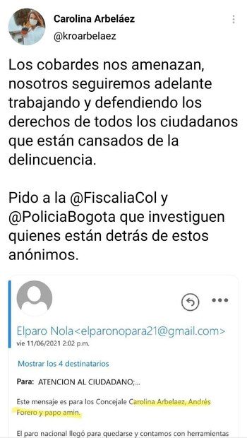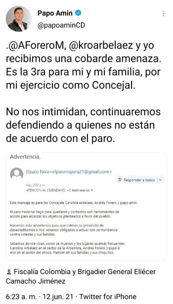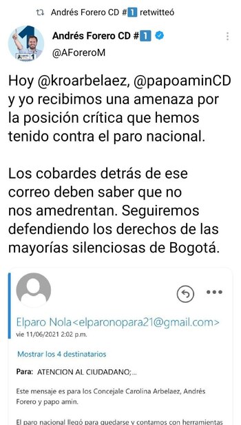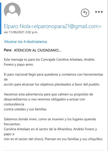 A dos cabildantes del Centro Democrático y uno de Cambio radical les llegó un correo anónimo mientras en el concejo se hacían un debate de control político al Distrito, donde recibieron amenazas por su postura frente al Paro Nacional. Así lo dieron a conocer mediante sus cuentas de twitter Papo Amín, Andrés Forero y Carolina Arbeláez, a quienes en un mensaje les advierten que saben en dónde viven, cómo se mueven y los lugares que frecuentan.