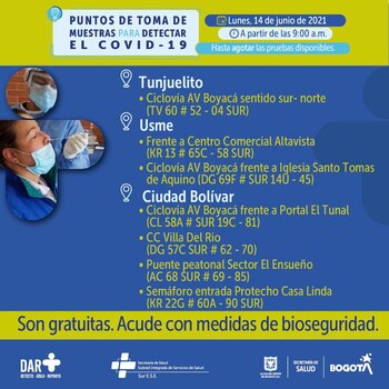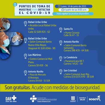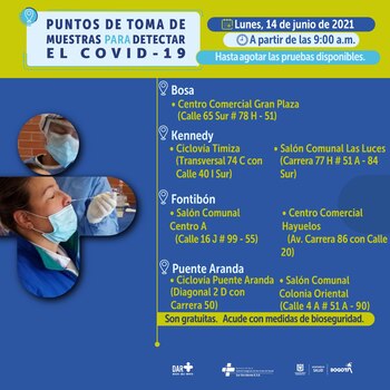 La capital colombiana continúa con las jornadas de toma de pruebas gratuitas de covid-19. Le contamos cuáles son los puntos habilitados por las cuatro Subredes del Distrito en las diferentes localidades, para este lunes 14 de junio.